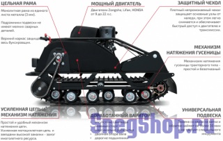 Специальная модульная рама и тракторный механизм натяжения цепи увеличивают надёжность устройства. Важно, что его можно использовать на укатанном снегу и даже по льду.