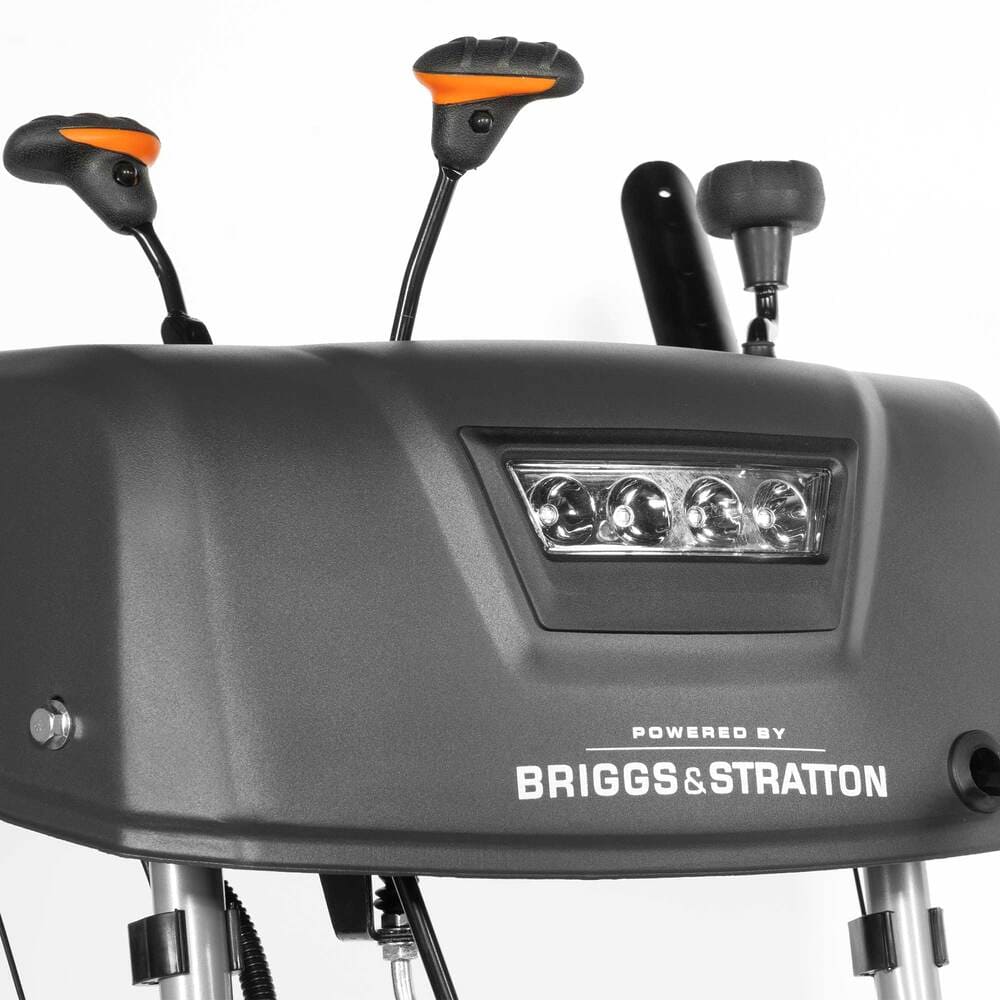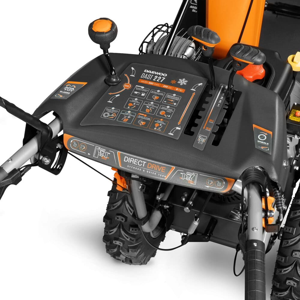 Надёжная машина для расчистки дорог, тротуаров и приусадебных территорий от свежего и наметённого снега. Воздушное охлаждение, объём 250 см³ и 8 л.с. обеспечивают стабильную тягу на укатанном и рыхлом снегу. Ручной стартер и электростартер для уверенного пуска в мороз. Максимальные обороты — до 3600 об/мин. Прочный режущий край эффективно разбивает наст и плотные снежные валы. Колёса с глубоким протектором сохраняют управляемость на укатанном и обледеневшем покрытии. Точная ориентация струи и дальность выброса до ~13 м уменьшают необходимость повторной проходки. Шесть передач вперёд и две назад — подбирайте темп под тип снега и рельеф участка. Освещение рабочей зоны и тёплые рукоятки повышают комфорт при низких температурах. Все рычаги на общей платформе — доступ к основным функциям без лишних движений. DAEWOO DAST 227 создан для интенсивной зимней эксплуатации на ровных твёрдых покрытиях и приусадебных территориях. Конструкция сочетает тягу и устойчивость, позволяя работать как со свежим, так и со слежавшимся снегом. Бензиновый двигатель Briggs & Stratton (8 л.с., 250 см³) с воздушным охлаждением развивает до 3600 об/мин. Два варианта пуска — ручной и электрический — упрощают запуск в холодную погоду. Поворотный желоб на 180° и дальность выброса до ~13 м ускоряют очистку больших площадей. Зубчатый металлический шнек эффективно дробит наст и снежные заносы. Ходовая с колёсами глубокого профиля сохраняет сцепление со скользкими поверхностями. Трансмиссия с 8 скоростями (6 вперёд / 2 назад) помогает подобрать оптимальный режим под плотность и высоту снежного покрова. Для работы в сумерках и при минусовых температурах предусмотрены LED-фара и подогрев рукояток. Эргономичная панель управления сокращает время на перенастройку и повышает продуктивность при длительных сменах. Снегоуборочная машина, руководство пользователя и базовый набор инструмента (по спецификации производителя). Стандартная гарантия 1 год согласно условиям производителя. Выполняйте обкатку, следите за состоянием шнека и натяжением приводов, соблюдайте регламент ТО. Уточняйте технические детали, совместимость аксессуаров и рекомендации по обслуживанию.Самоходный снегоуборщик DAEWOO DAST 227