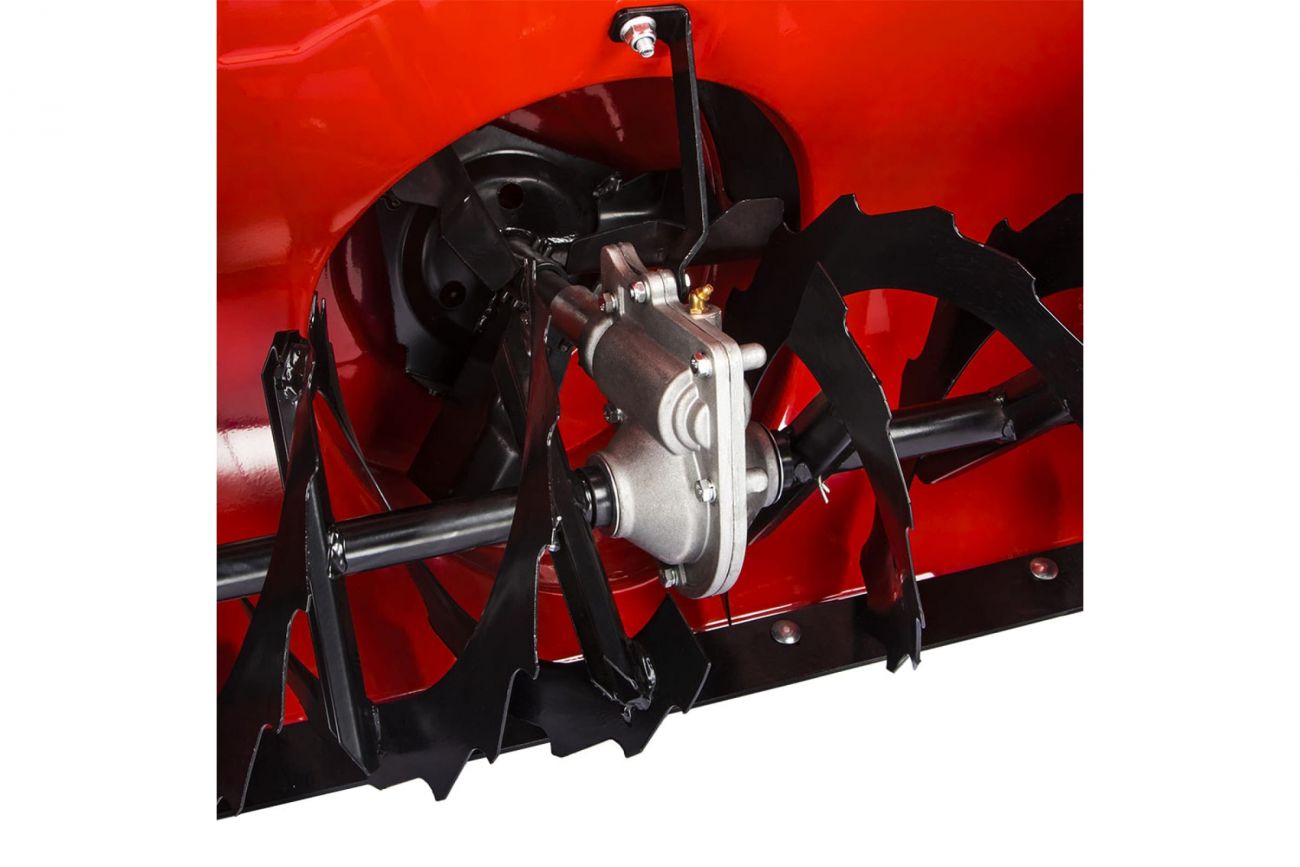 Машина оборудована стальным шнеком с зубцами, который позволяет очищать даже старый, уплотнившийся снег. Дальность выброса снега составляет до 12 метров, что делает работу максимально эффективной.