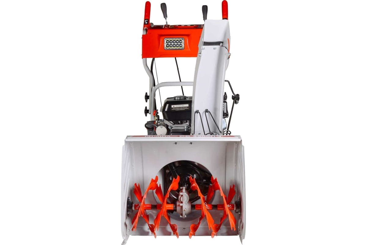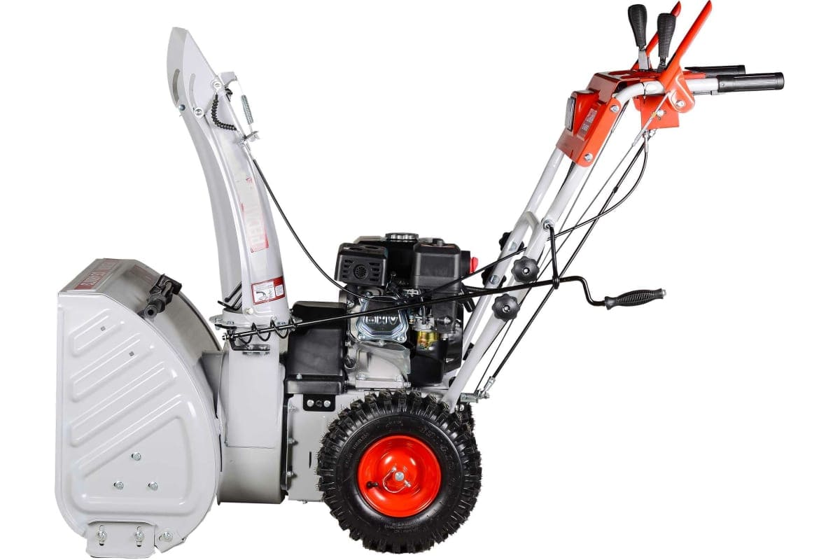 Бензиновый мотор 196 см³ с воздушным охлаждением стабильно запускается в мороз и обеспечивает достаточную тягу для уверенной уборки.