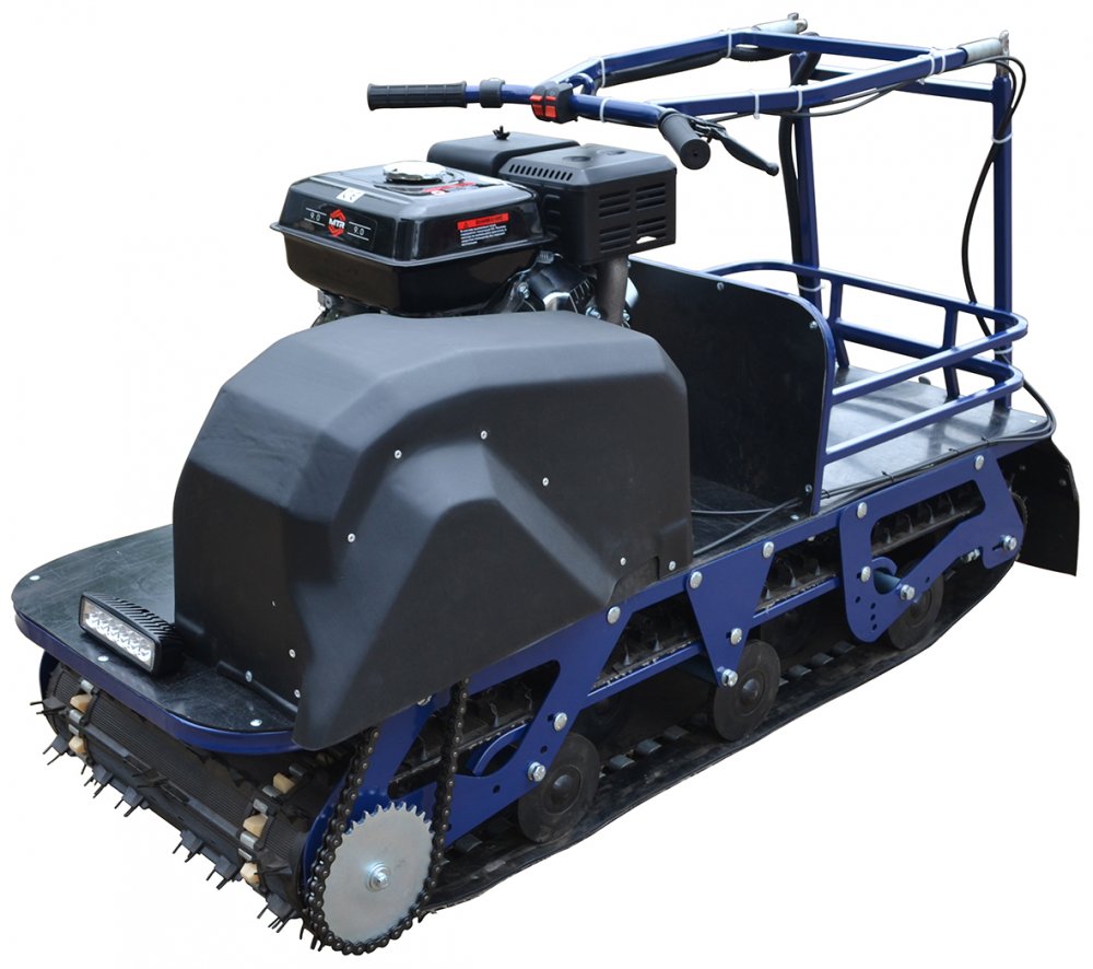 С мощностью двигателя 13 л.с., мотобуксировщик способен развивать скорость до 45 км/ч и перевозить до 200 кг груза. Его гусеница шириной 500 мм и катковая подвеска обеспечивают отличную проходимость, даже по ледяным покрытиям и твердым грунтам.