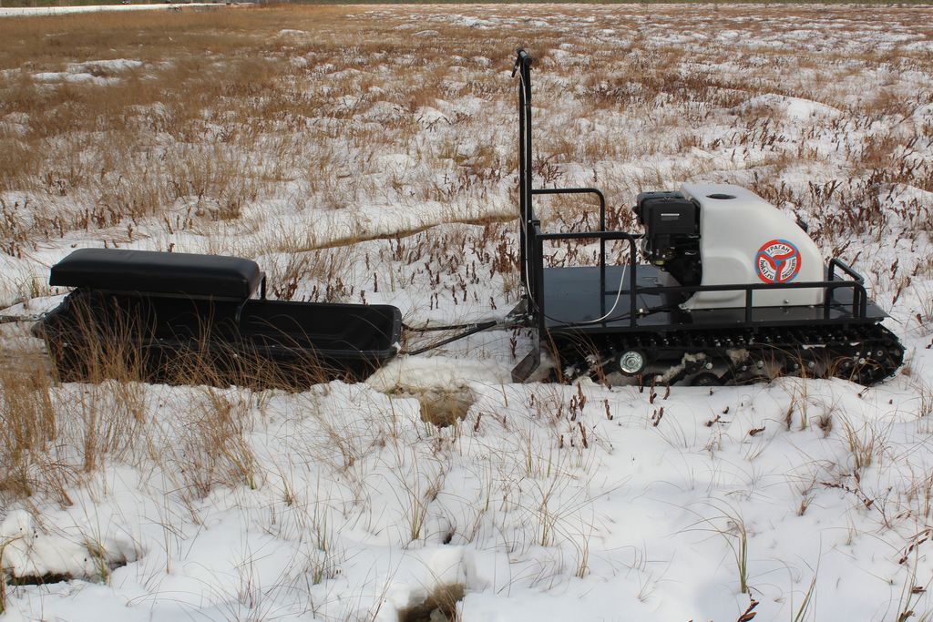 Универсальный вездеход для охоты, рыбалки и хозяйственных задач: уверенная тяга на рыхлом снегу и мягком грунте при компактных габаритах. 4-тактный мотор 420 см³ (15 л.с.) развивает стабильную тягу для буксировки на целине и подъёмах. Цельная резиновая гусеница 500 мм увеличивает площадь опоры, улучшая зацеп и устойчивость. Специальная система не допускает накопления снега внутри трака, снижая лишний вес и нагрузку. Д×Ш×В: 169×100×85 см. Габариты и развесовка помогают уверенно маневрировать в стеснённых местах. Морозо- и вибростойкий капот, чехол карбюратора и утепление снижают риск обледенения ДВС. Задняя площадка до 50 кг; при установке саней — дополнительная перевозка до ~250 кг.