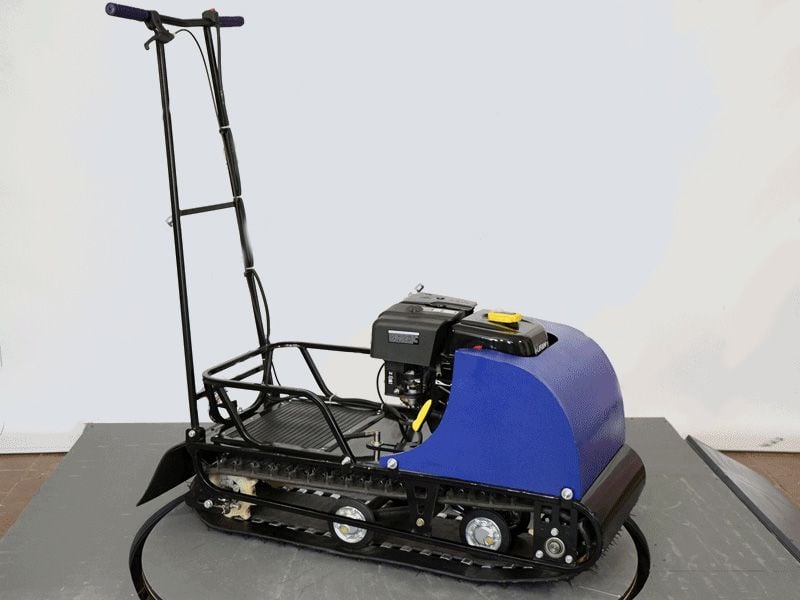 Гусеница шириной 380 мм в сочетании с катковой подвеской и пружинной амортизацией сглаживает неровности и помогает сохранять сцепление на разном типе покрытия. Модульная компоновка (гусеничный блок, двигатель, рулевая секция, сиденье) упрощает хранение и перевозку.