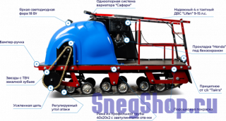 усиленная рама с площадкой под груз, катковая подвеска со склизами и широкая гусеница 500 мм обеспечивают устойчивый ход на рыхлом снегу, насте и мягком грунте.