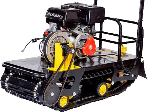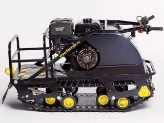 Силовая установка объёмом 270 см³ развивает 9 л.с., позволяя разгоняться до ~40 км/ч и уверенно перевозить до ~250 кг груза на санях или платформе.