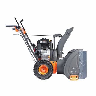 Оснащён 11-сильным бензиновым двигателем объёмом 302 куб. см, который выдерживает морозы до -35°C. Эта модель с двухступенчатой системой с шнеком из бронзы и металлическим зубчатым шнеком обеспечивает отличную работу даже с обледеневшим снегом.