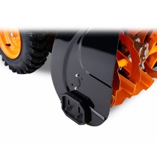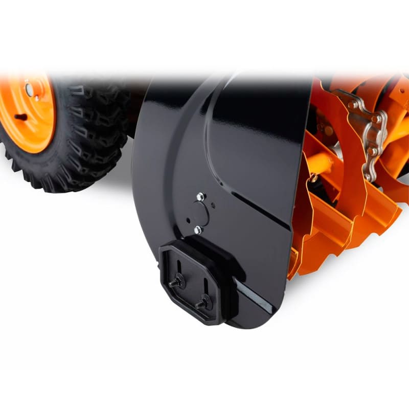 Двухступенчатая схема повышает производительность: шнеки дробят массу, после чего снег энергично выбрасывается через раструб. Пластиковые полозья задают высоту ковша, а шины с глубоким протектором улучшают проходимость и устойчивость.