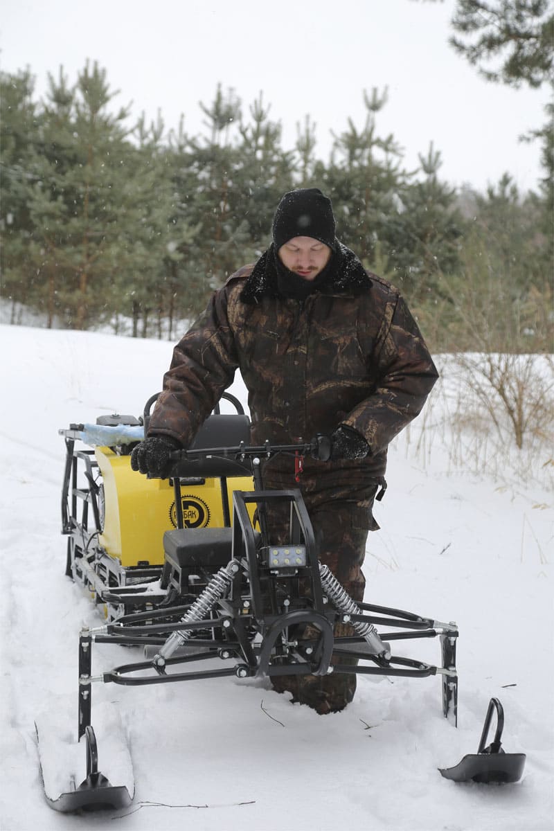 Надёжный двигатель 13 л.с. обеспечивает уверенную тягу и скорость до ~40 км/ч для перевозки груза и буксировки саней.