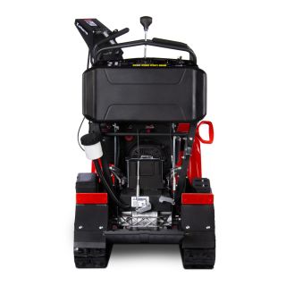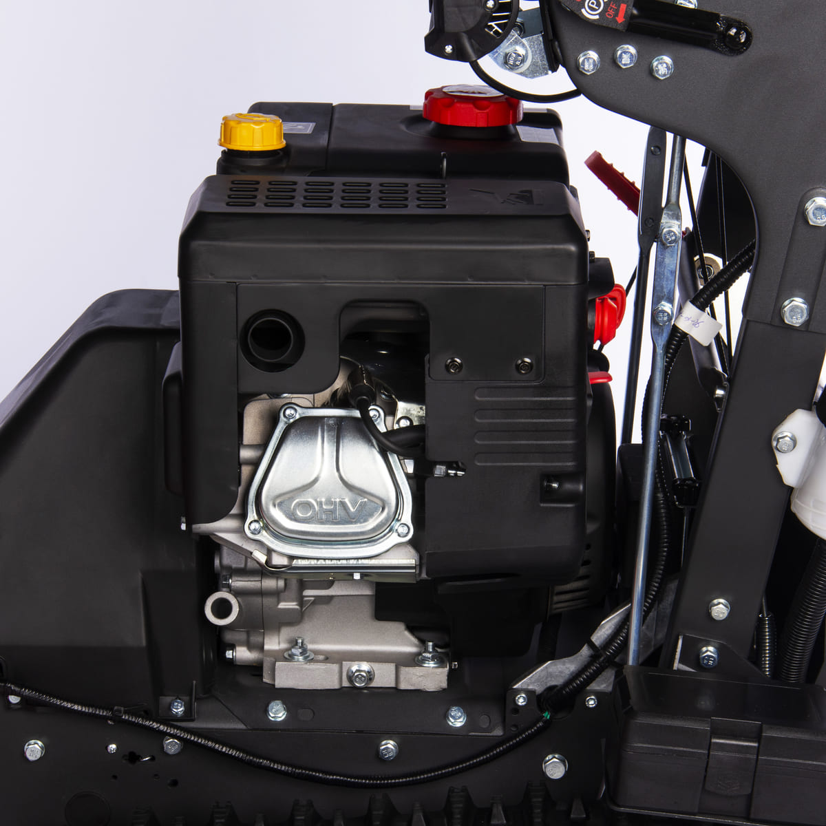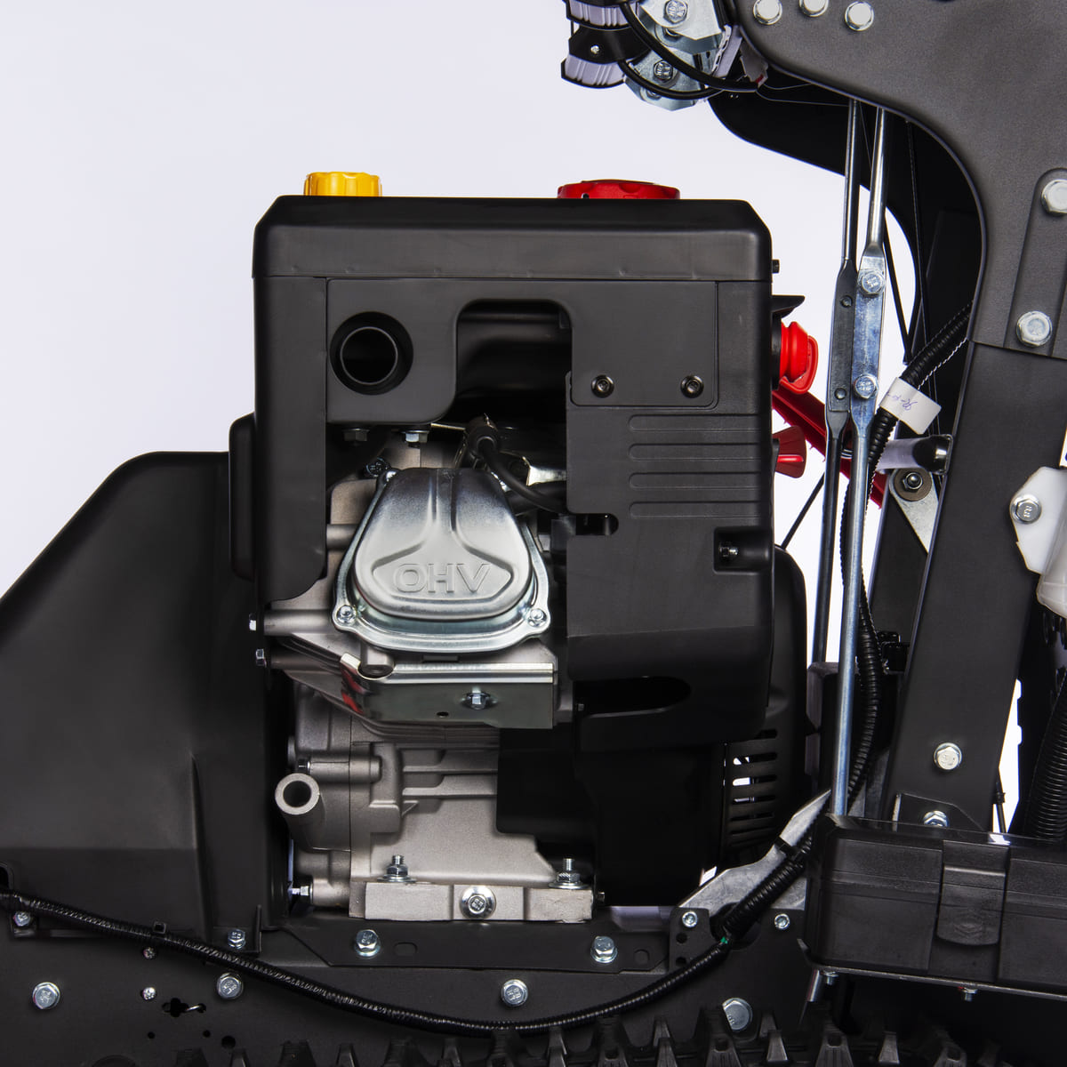 Профессиональная гусеничная машина с гидростатической трансмиссией и двухступенчатым выбросом — компактная, выносливая и крайне производительная. Верхнее расположение клапанов для эффективного смесеобразования, чистого выхлопа и повышенного ресурса. Чугунная гильза цилиндра, точная подгонка узлов. Соответствие CARB/EPA. Гидростатическая трансмиссия и вариаторная коробка Multitronic обеспечивают плавное изменение скорости/направления и реализацию крутящего момента до 300 Н·м на низких оборотах. Шнек с центральным ледорубом измельчает массу; крыльчатка из хромомолибденового сплава (до 1200 об/мин) отбрасывает снег на расстояние до 18 м. Смещённый к ковшу центр тяжести, редуктор ресурса 12 000 ч (масло 80W90), агрессивный шнек из легированной стали и трёхточечное крепление для работы по наста и льду. Гусеницы прямоугольного профиля с «антиналедь» и самоочисткой увеличивают пятно контакта, повышая проходимость на рыхлом и укатанном снегу и на склонах. Инновационная система дифференциала с ЭБУ обеспечивает разворот на месте и лёгкое маневрирование в ограниченном пространстве. Цельный корпус редуктора, оси в шарикоподшипниках, направляющие на ковше для снижения износа и увеличения ресурса при тяжёлых режимах. Регулировка положения и угла выброса с панели оператора во время движения.