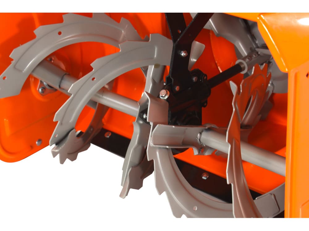 Двухступенчатая схема эффективно рыхлит и выбрасывает плотный и слежавшийся снег, а стальной желоб обеспечивает устойчивую траекторию выброса до ~15 метров.