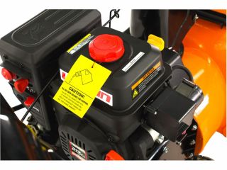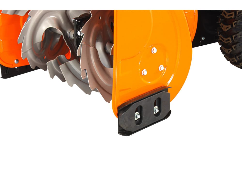 Управление желобом вынесено на фронтальную панель, а опорные лыжи из металла и пластика облегчают перемещение по разным типам покрытия.