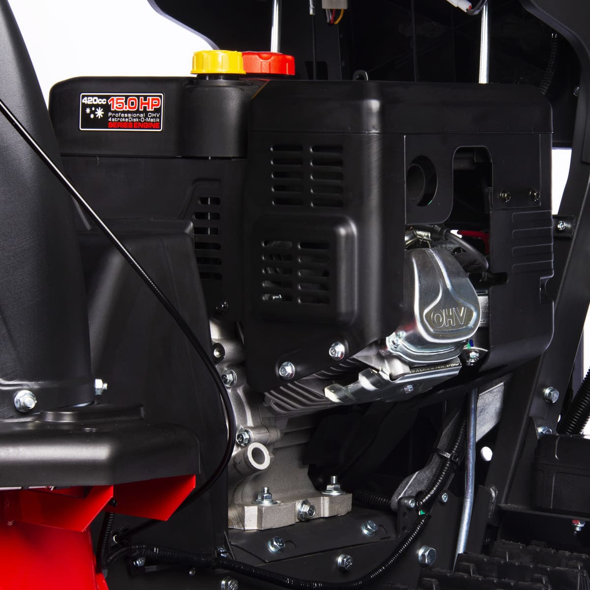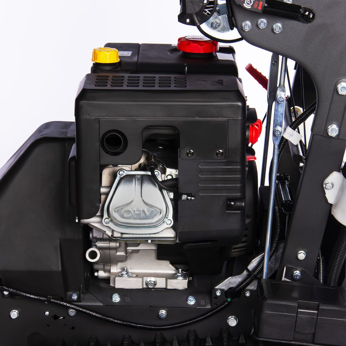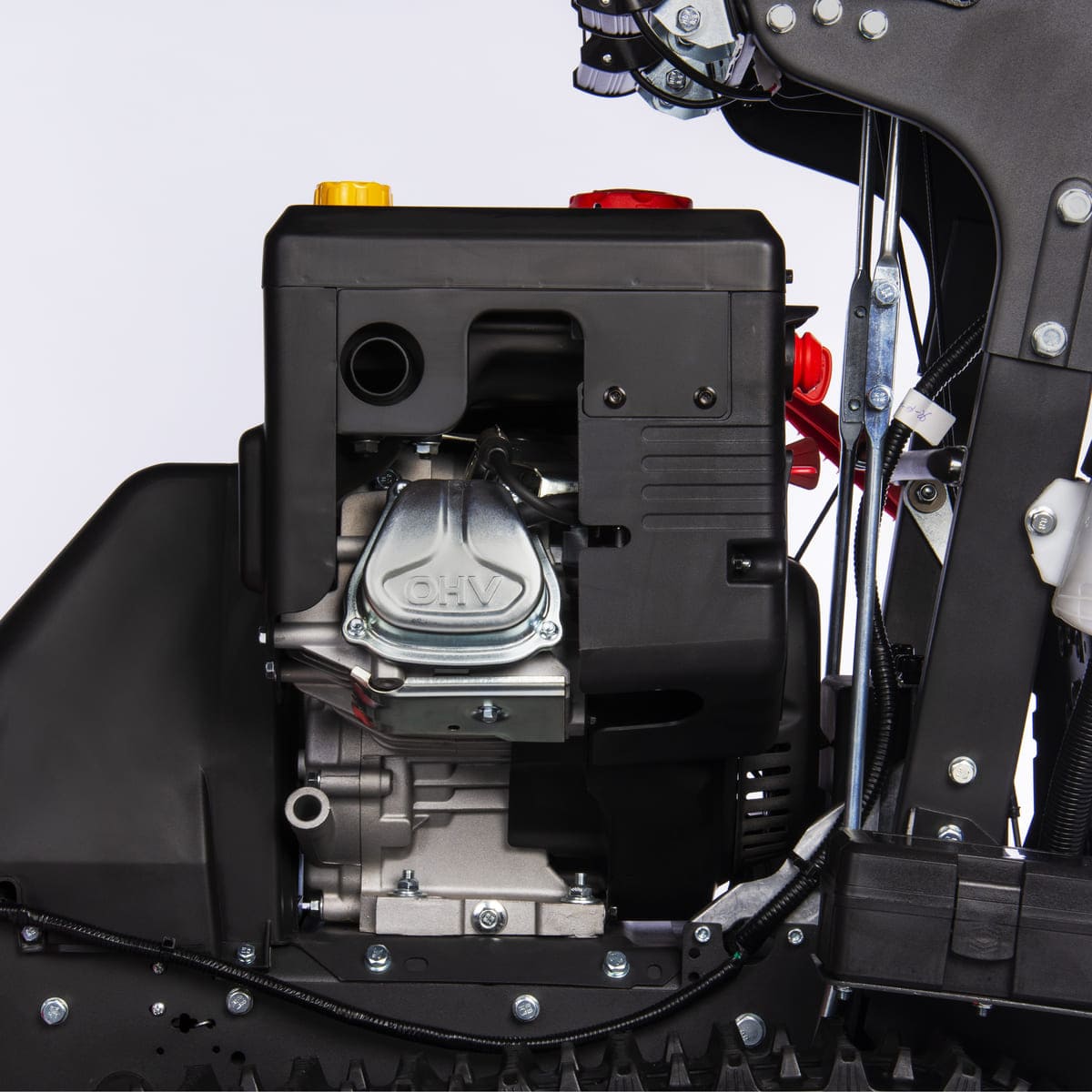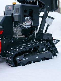 Профессиональная гусеничная машина для тяжёлых условий: гидростатика, высокий крутящий момент и двухступенчатый выброс снега. Технология OHV, чугунная гильза цилиндра и точная подгонка деталей обеспечивают высокий КПД и ресурс. Соответствие CARB и EPA. Плавное бесступенчатое изменение скорости и направления, реализация высокого момента на низких оборотах для тяжёлого снега. Усиленный шнек с ледорубом измельчает массу; крыльчатка 1200 об/мин из хромомолибденового сплава отбрасывает снег до 21 м. Низкий центр тяжести, редуктор ресурсом до 12 000 ч, агрессивный шнек и трёхточечное крепление для работы по насту и льду. Прямоугольные гусеницы с самоочисткой увеличивают пятно контакта и обеспечивают проходимость на рыхлом и укатанном снегу. Кнопки на панели оператора: регулировка дефлектора и высоты ковша, режим плотного прилегания для чистой уборки.