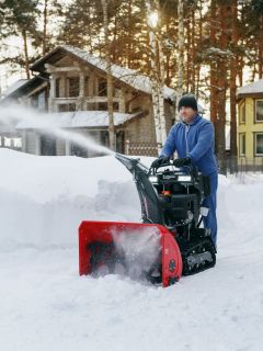 Гусеничный ход с системой «антиналедь» и самоочисткой даёт уверенную тягу на ровных и неровных рельефах. Электронное управление дефлектором и ковшом упрощает настройку траектории выброса и высоты захвата прямо на ходу.