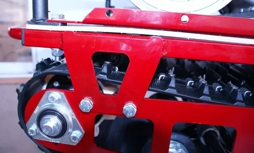 Всесезонная утилитарная машина для глубокого снега и льда: надёжная тяга, простое обслуживание и высокая проходимость. 4-тактный мотор объёмом 420 см³ (15 л.с.) обеспечивает тягу на целине и скорость до ~45 км/ч. Опоры из резины снижают шум и вибрации. Открытая конструкция для эффективного выброса снега. Каркас безопасности и металлический капот защищают силовые узлы. Широкая лента и катковая подвеска уверенно идут по рыхлому снегу, насту и даже по твёрдой поверхности без снега. Двигатель и трансмиссия на единой подмоторной плите — шкивы выставлены точно, исключён перекос ремня. Надёжная цепь (Латвия) и удобный роликовый механизм позволяют обслуживать привод без снятия облицовки. LED-оптика 12 SMD (36 W, 1320 Lm) улучшает видимость на маршруте и безопасность движения в сумерках.