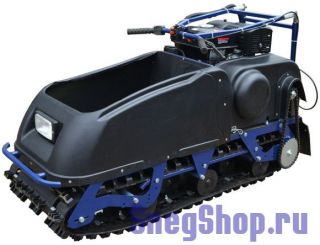 Утилитарный буксировщик среднего класса для глубокого и рыхлого снега, льда и твёрдой поверхности. Двигатель 270 см³ (9 л.с.) обеспечивает тягу для разгона до ~45 км/ч и уверенную буксировку. Плавное изменение передаточного числа; ремни SOLID, MTR или RUBENA для надёжной работы. Лёгкая смена схемы без переделок. Усиленные пружины держат нагрузку на целине и льду. Пол и бампер из ПНД: стойкость к влаге, отсутствие наледи, защита рамы при загрузке. Широкая лента и катковая подвеска дают стабильный ход по рыхлому снегу и твёрдому покрытию. Компактные габариты 150×57×80 см и руль у основания рамы — для точного контроля. Яркая фара для тумана и ночи, чека аварийного отключения — для безопасной эксплуатации. С подпружиненной «собачкой» — надёжное сцепление саней при перевозке груза до ~300 кг.